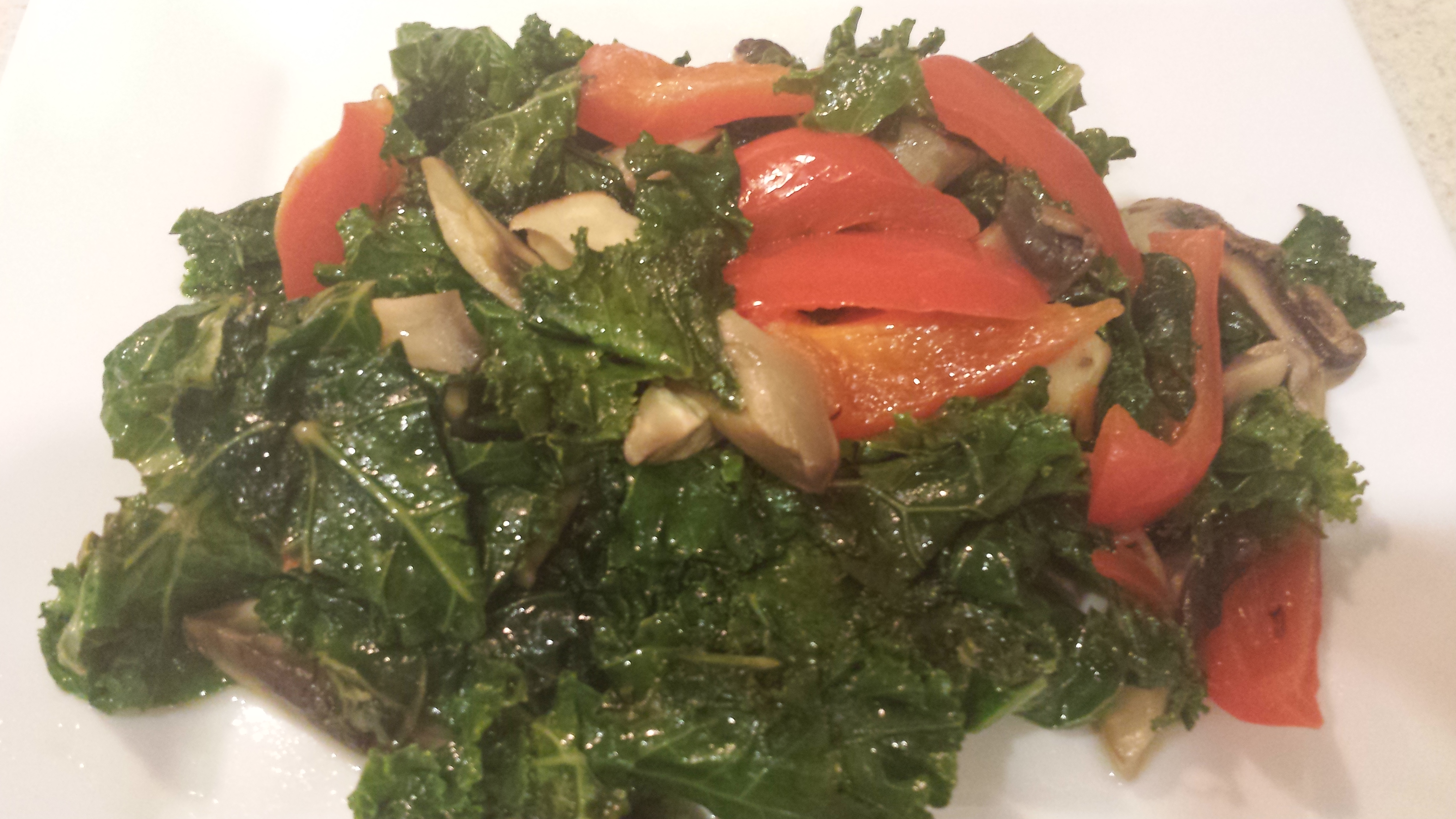 You may want to just heat the mushroom and pepper and add to the room temperature kale just like Kimberly Snyder did or heat the kale like I did. Its pure deliciousness. I enjoyed it with quinoa and some ripe plantains.